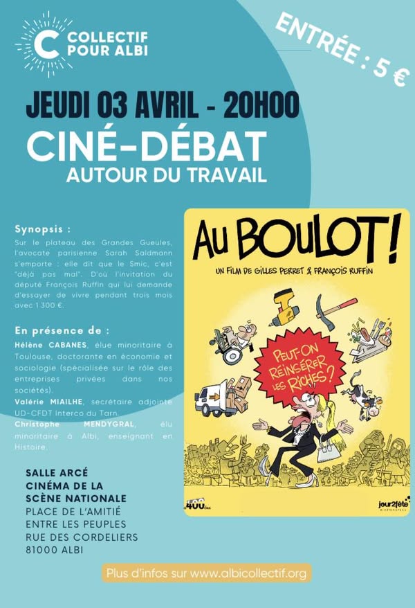 Le Collectif pour Albi invite les albigeois et grands albigeois à venir aborder le sujet du travail à l’occasion de la projection du film « Au boulot ! ».